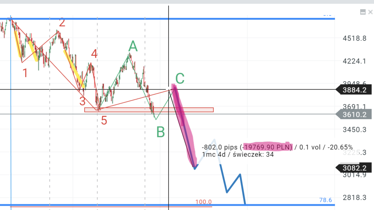 Gdybyś zainwestował 4600 zł w kontrakt na SP500 na spadki osiągnąłbyś ponad 230% zysku w zaledwie miesiąc. Oczywiście cała spadkowa fala była znacznie większa.